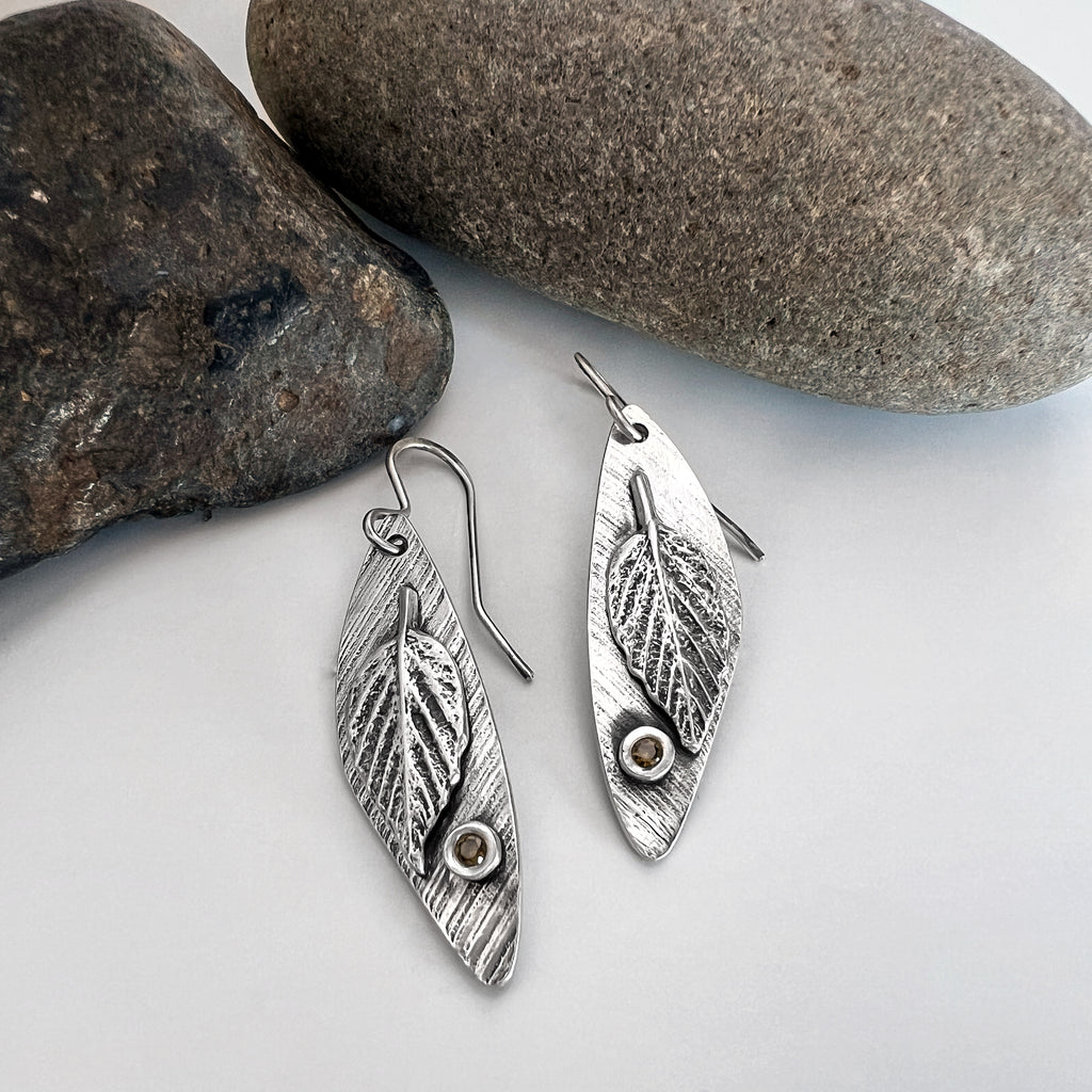 Crafted from fine silver clay, these free form corylopsis earrings feature real leaf impressions for a truly unique and nature-inspired design. The sterling silver ear wires add a touch of elegance, making them a perfect accessory for any occasion. Elevate your style with these beautiful and one-of-a-kind botanical jewelry pieces.