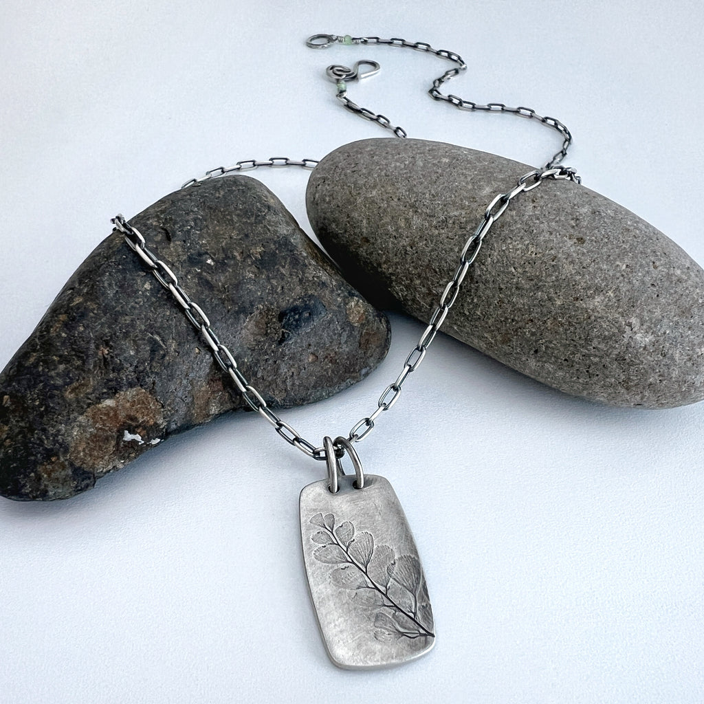 This Maiden Hair Fern Necklace features fine silver clay imprinted with a real fern frond for a truly unique nature-inspired piece. Show off your love for nature with this beautiful and delicate necklace. Let nature shine and elevate your jewelry collection with this stunning necklace.