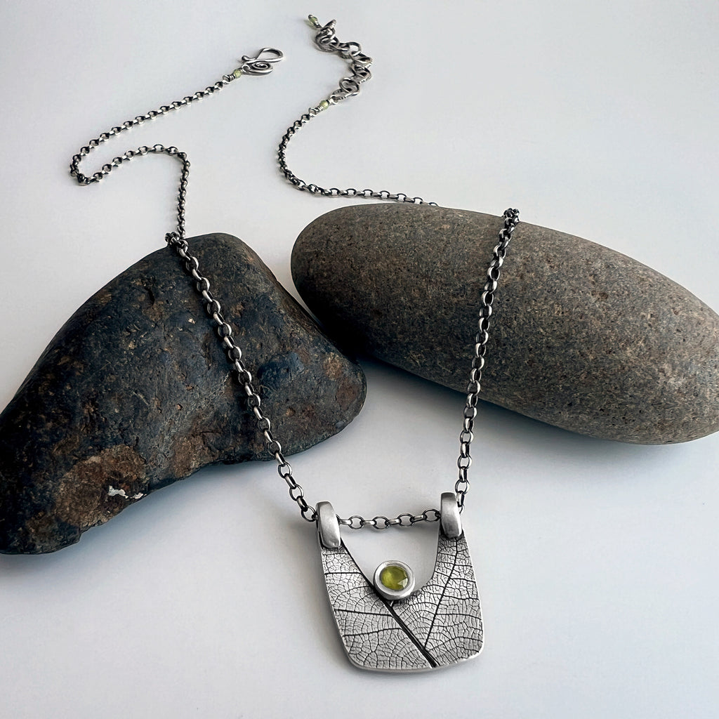 Elevate your style with the Modern Silver Leaf Necklace. Crafted with fine silver clay, this necklace features a stunning leaf imprint and a vibrant 4mm lab created peridot accent. The simple and clean design adds a touch of sophistication to any outfit. Experience the perfect balance of modern and elegant with this necklace.