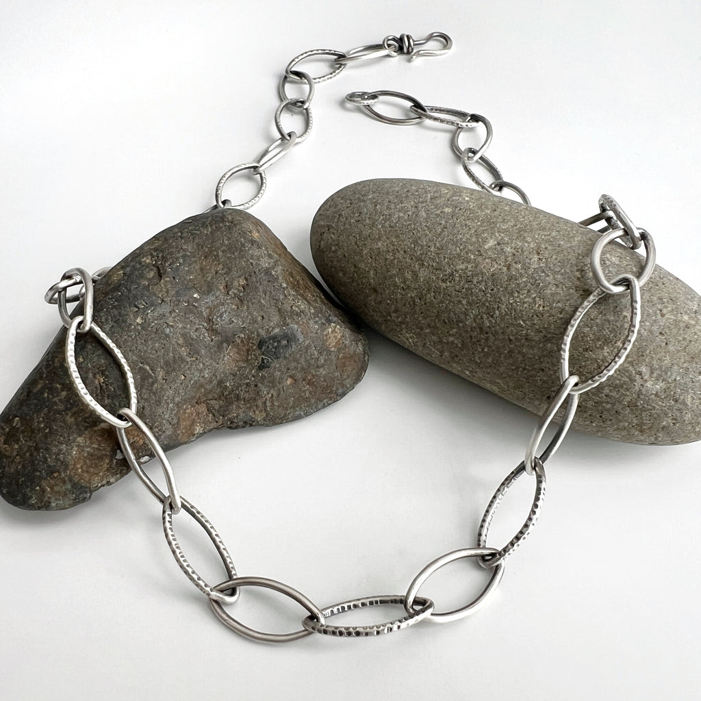Elevate your style with our Silver Marquis Chain Necklace. Handmade from fused fine silver, this unique artisan chain boasts a stunning marquis design. Create a layered look by pairing it with other chains. A must-have for any jewelry lover.