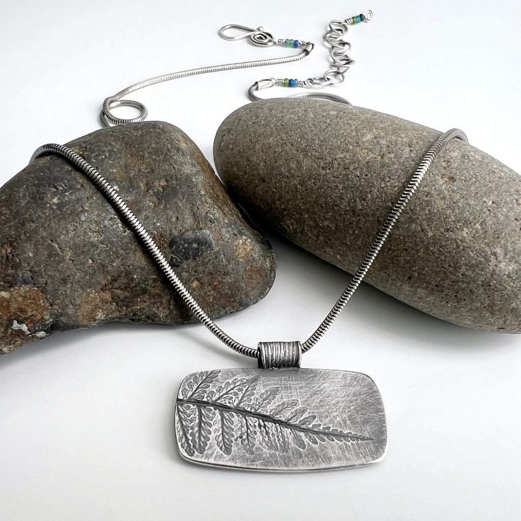 This beautiful rustic fern necklace is truly one of a kind. Handmade from an impression of a real fern frond impressed into fine silver clay. Lovely details were added and the pendant hangs from a sterling silver snake chain. The entire necklace was given a darkening patina, and then polished to a satin finish; leaving the patina in the recesses of the design allows it to really stand out.