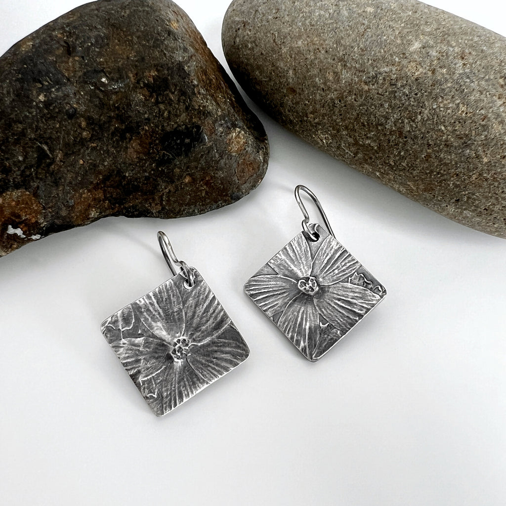 Experience a touch of nature with our Flower Power Earrings. Handcrafted with fine silver clay and featuring a delicate flower imprint, these earrings hang from sterling silver ear wires and are shaped into a diamond. Embrace your inner flower child with these unique, one-of-a-kind earrings.