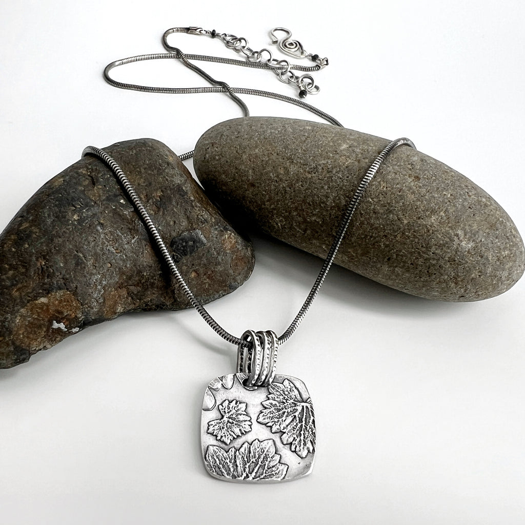 This exquisite Silver Geranium Pendant features fine silver clay imprinted with delicate geranium leaves. Showcasing your love for nature, this pendant brings a touch of garden beauty to your ensemble all year round. Crafted with fine details and elegance in mind, it's the perfect accessory for any nature lover. Who wouldn’t love this gorgeous handmade silver geranium pendant. Treat yourself or give a gift of nature in silver to someone special.