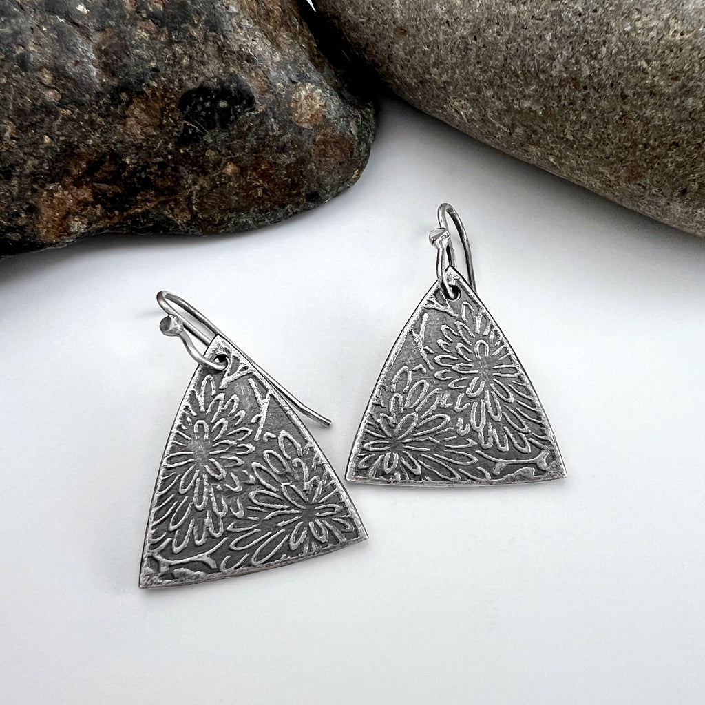 Expertly crafted from fine silver clay, these Textured Flower Earrings feature a unique triangle shape and sterling silver ear wires. With a delicate floral design imprinted into the silver metal clay, these earrings are a beautiful and elegant addition to any outfit. Made to last, these earrings are sure to become a cherished piece in your jewelry collection.